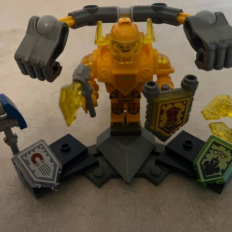 LEGO Nexo Knights Axl figur byggesæt. Komplet. Sættet indeholder dele til at bygge Axl-figuren fra Nexo Knights-universet samt tilhørende våben og skjolde. Der medfølger byggevejledning og flere Nexo-skjolde, som kan sættes på figuren. Velegnet som samlesæt til LEGO Nexo Knights-temaet og til leg med actionfigurer og fantasy-scener. Kommer fra ikke-ryger hjem