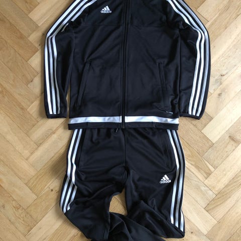 Træningsdragt, trøje og bukser i sort med hvid stribe over skulderen og hvid stribe på bukserne.