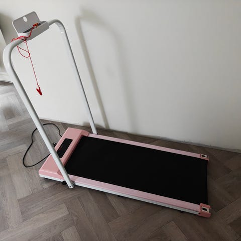 Reebok løbebånd med elektronisk display og betjeningspanel. Løbebåndet har håndtag foran displayet og kopholdere i hver side. Displayet viser typisk data som tid, hastighed, distance og kalorier samt mulighed for at vælge forskellige træningsprogrammer. Egnet til indendørs konditionstræning og gang- eller løbetræning i hjemmet.