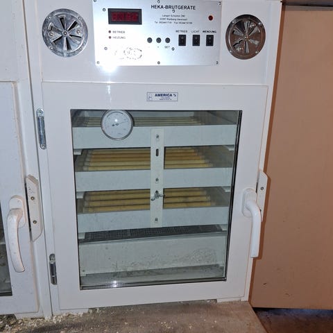 Halvautomatisk rugemaskine, æggebakker kan vendes med fx skrue trækker, da håndtaget mangler. Hvilket har fungeret fint for mig.