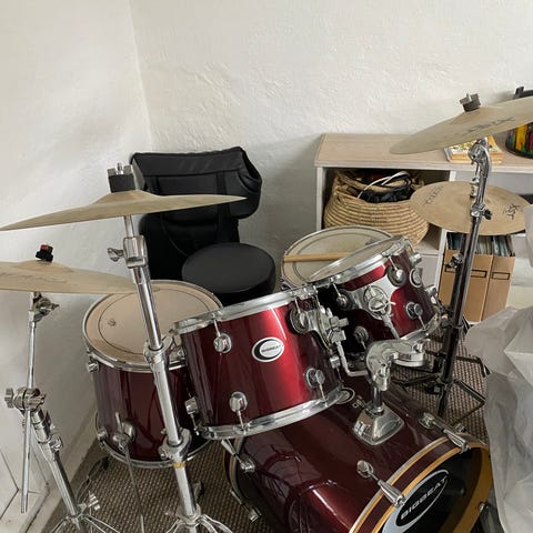Maestro trommesæt i rød finish. Sættet består af stortromme med enkelt pedal, lilletromme, flere tamtrommer samt gulvtam. Der medfølger bækkener monteret på stativer, trommestol og et par trommestikker. Velegnet som komplet trommesæt til øvning og spil i hjemmet eller øvelokalet.