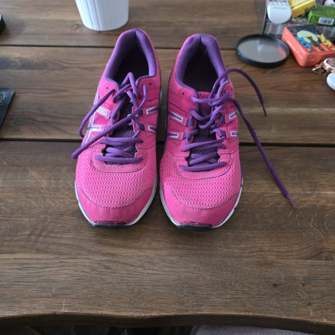 Asics løbesko i størrelse 38. Skoene er sorte med pink ydersål og lyse detaljer på siden. Overdelen er i tekstil/syntetisk materiale med snørelukning. Mellemsålen er polstret for stødabsorbering, og ydersålen har mønster for greb på underlaget. Velegnet til løb og anden træning.