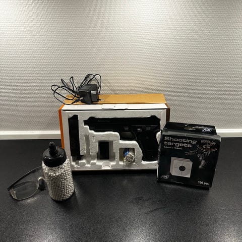 Har denne asg g17 pistol. Pistolen virker ikke men kan repareres hvis man ved hvordan det skal gøres. Der medfølger 4 mags der også passer til en manuel hardball m92 eller en m92fs. Den er perfekt til udstilling eller bare som legetøj.
