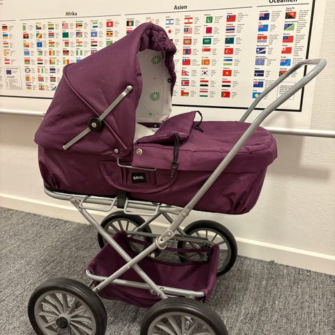 BRIO dukkevogn i mørkeblå farve. Vognen har justerbart kørehåndtag, liggedel med kaleche og varekurv under vognen. Den er udstyret med fire hjul, hvor de forreste er drejelige og baghjulene er stabile. Liggedelen er aftagelig og har et lille underlag.