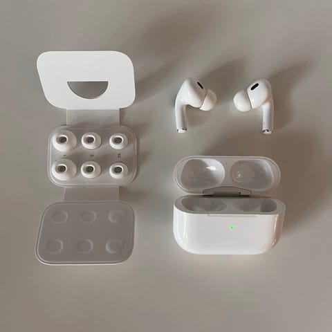 Apple AirPods Pro høretelefoner i hvid farve. Trådløse in-ear høretelefoner med opladningsetui. Egnet til brug med kompatible Apple-enheder og andre enheder, der understøtter Bluetooth. Leveres med kompakt etui, der fungerer som opbevaring og oplader for høretelefonerne.