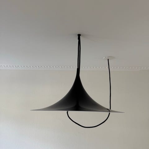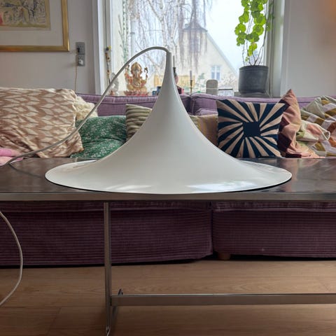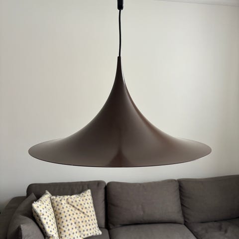 Gubi Semi pendel designet af Claus Bonderup. Loftlampen har et karakteristisk, kegleformet skærmdesign med bred åbning, der giver nedadrettet lys. Udført i aluminium med ensartet Chrome overfladefinish. Velegnet som belysning over spisebord, sofabord eller i køkken og opholdsrum. Bruger standard pære med E27-fatning (pære ikke inkluderet). Det er enkelte brugsspor.