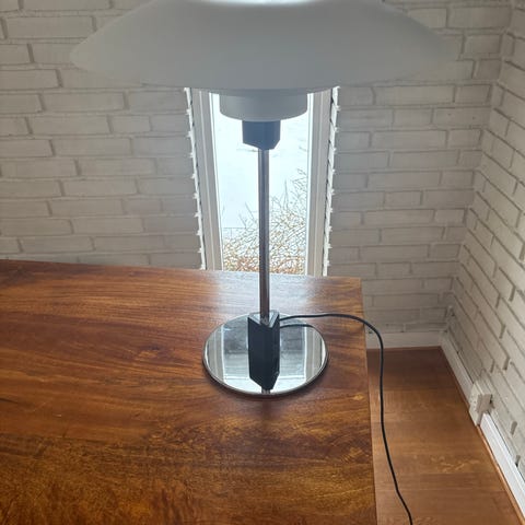 Louis Poulsen PH 4/3 bordlampe i hvidlakeret metal med kromfarvet stander og rund fod. Lampen har en bred, flad skærm.