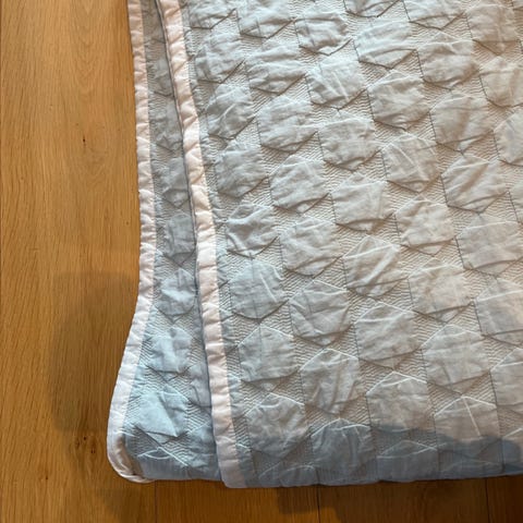 HAY Mega Dot Sengetæppe i størrelsen 235x245 cm og farven mørkegrå, Er brugt men i fin stand, Ingen flænger, huller, pletter eller andet udover et enkelt lille udsnit nede ved kanten tættest på gulvet, hvor tråde er gået lidt op (Kan ses på billede 3). Er fra røgfrit og dyrefrit hjem.