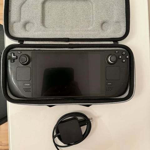 Valve Steam Deck håndholdt konsol i sort med alt tilbehøre (case og oplader). Der medflg desuden 512 gb Micro SD fra Samsung, så der er masser af plads til download af spil fra Steam biblioteket.