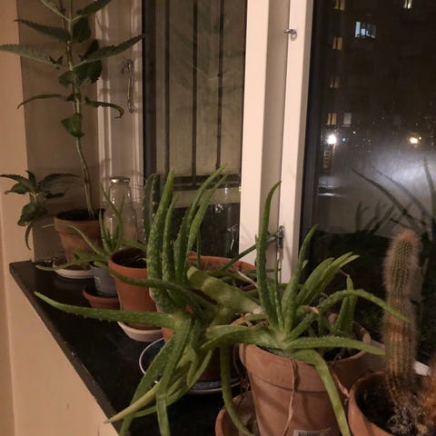 Mine overbo har denne store Aloe Vera, som de ikke længere føler de kan finde plads til. De vil dog gerne beholde babyerne, så det er kun den store plante der sælges og uden potte.