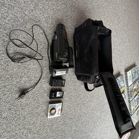 Fuldt velfungerende videokamera med diverse tilbehør.