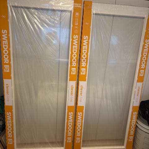 1 stk Swedoor Stable HL GW Fiber skydedør. 925x2040x40 mm i hvid. Monterete med not i bund og 2 runde skåle i krom