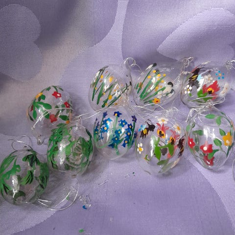 Påskeæg med ophæng. En enkelt sløjfe er gået op. Grønne, gule og orange.