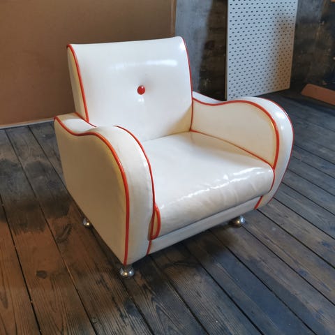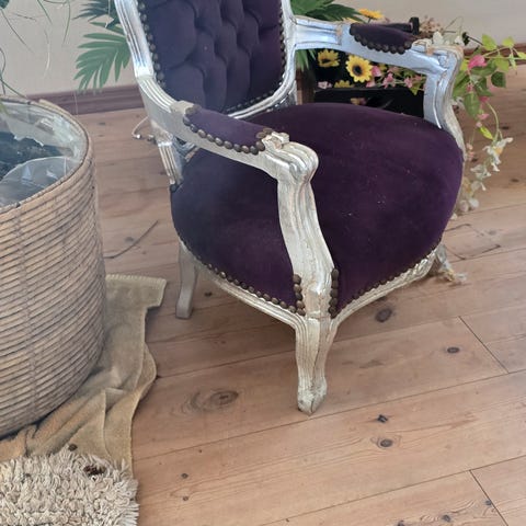 Snedkerfremstillet lænestol i mahogni, tilvirket på Nordfalster i ca. 1915 til en lille pige (min farmor) og en tilsvarende opskalleret stol til en voksen (lyserød plys). Siddehøjde: 42 cm. Stribet betræk, ombetrækning måske ønskelig. Mål: h 98,5 cm, bredde 50,5 cm, siddehøjde 42 cm. Kan evt. leveres ifølge aftale.