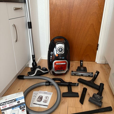 OBH Nordica X-Force Flex 9.60 ledningsfri støvsuger. Støvsugeren er en skaftmodel med fleksibelt rør og aftagelig håndenhed. Den har beholder til støv i den øverste del af skaftet og motoriseret mundstykke til gulve. Medfølgende tilbehør omfatter flere mundstykker og opladerstation, som ses på billederne. Velegnet til almindelig rengøring af hårde gulve og tæpper i hjemmet.