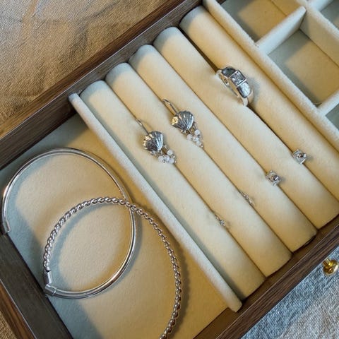 Bemærk: nogle af smykkerne kan have lidt mørke mærker fra iltpåvirkning. Kan sikkert fjernes ved rens.