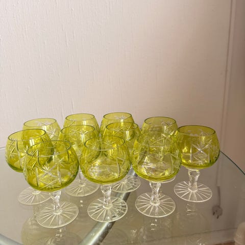 Sæt med seks vinglas i rødt bøhmisk krystal med klart, facetslebet stilk og fod. Glassene har indgraveret blomstermønster og dekorative detaljer på kuplen. Velegnet til servering af vin eller andre drikke ved borddækning og festlige lejligheder.