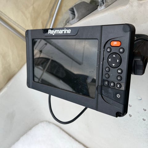 Raymarine marineplotter med integreret skærm. Enheden leveres med frontdæksel og trykt manual. Plotteren er egnet til montering i båd til navigation og visning af søkort og relaterede data. Strøm- og signalkabler samt eventuelle sensorer eller transducere fremgår ikke af billedet og kan derfor være nødvendige at tilkøbe separat afhængigt af installationen.