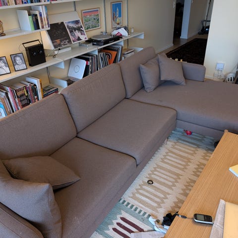 Hynder med kombination af dun og skum. Sofaen er nyrenset og fremstår pæn uden grimme pletter eller huller. Der er en smule lysere farve på toppen af ryghynderne, men det ses kun let og sofaen står samlet set flot.