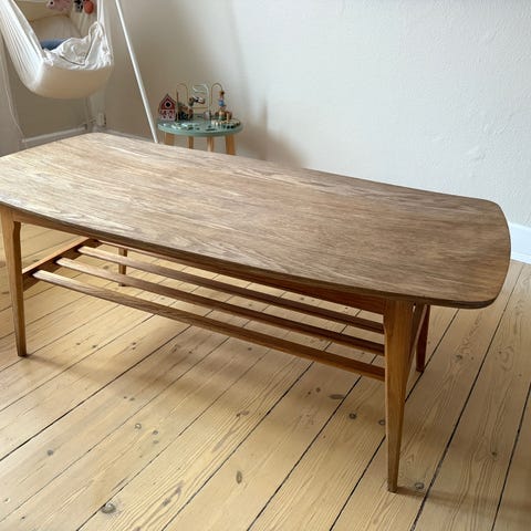 sofabord i eg med enkel, moderne udformning. Bordet er lavet af egetræs-rester fra andre projekter. Mega fedt. Men derfor fremgår der også nogle X'er rundt omkring. Ikke noget man lægger mærke til dog. Se billederne.