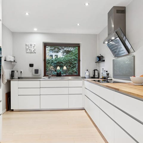 Komplet køkken i hvidt design med lyse laminat bordplade. Køkkenet består af underskabe med skuffer, vægskab, åbne hylder og bordpladeplads i begge sider af rummet. Der er indbygningsovn og sort kogeplade integreret i bordpladen samt vask med armatur.