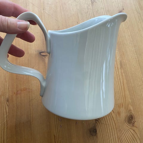Bing & Grøndahl kande i hvidt porcelæn med træhåndtag. Henning Koppel, Kanden er sjælden og har hældetud og rund form, egnet til servering af f.eks. sauce, mælk eller andre varme og kolde væsker. Porcelænet er glaseret, og bunden er stemplet med Bing & Grøndahl-logo. Træhåndtaget giver et godt greb og fungerer som varmeisolering mellem hånd og kande. Velegnet til brug i køkken og ved bordservering.