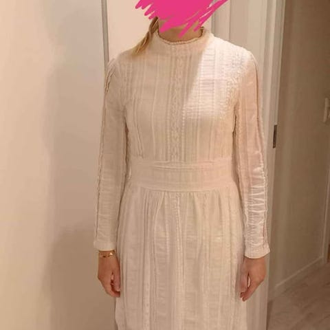 Købt ny til konfirmation i juni 2025. Kjolen er tilpasset af skrædder, men svarer til en str. 34 eller en lille str. 36. Brugt den ene dag og i stand som ny. Kvittering haves. Nypris kr. 3.435.