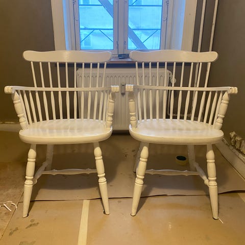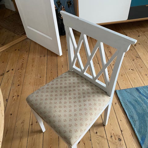 Gode og stabile stole med god støtte, høj håndværksmæssig kvalitet, brugt, men i fin stand, beklædningen kan med fordel tages af og vaskes
