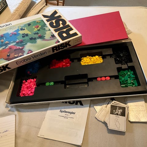 Klassisk strategispil, hvor spillerne kæmper om verdensherredømmet på et verdenskort. Spillet indeholder spilleplade med verdenskort, plastbrikker i flere farver, terninger og kort. Egnet som familiespil og strategispil for flere spillere rundt om bordet.