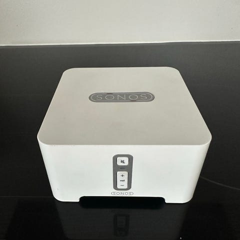 Sonos Connect gen 1 . Enheden bruges til at tilslutte eksisterende stereoanlæg eller aktive højttalere til Sonos-systemet via analoge og digitale lydudgange. Bagsiden har netværksporte (Ethernet), optisk og koaksial digital udgang samt analoge RCA-ind- og udgange. På fronten er der knapper til lydstyrke og afspilning/pause. Enheden kræver strømtilslutning og netværksforbindelse for at fungere som en del af et Sonos multiroom-lydsystem.