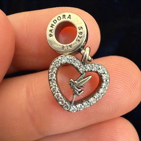 * Ægte Pandora Disney charme i sterlingsølv (925). Hjertedesign med Klokkeblomstfigur og klare sten. Mærket S925 ALE og © Disney. Fløjlsetui medfølger.