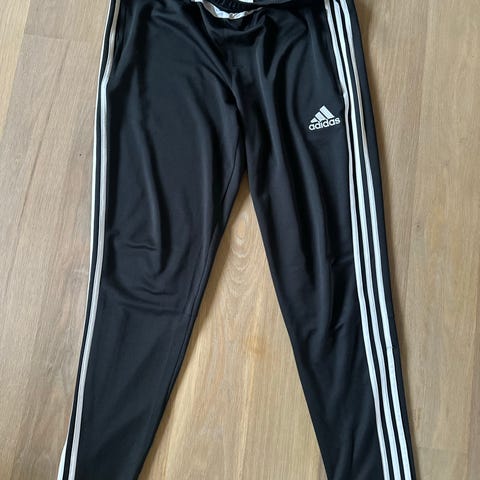 Adidas træningsbukser til fodbold i herremodel, størrelse XL. Bukserne er sorte med røde detaljer i siderne og ved benafslutningen. De har elastisk talje med snøre for justerbar pasform samt lynlås ved anklerne, som gør dem nemme at få af og på over sko eller støvler. Velegnede til fodboldtræning og anden sport. Materialet er et syntetisk funktionsmateriale, der er let og hurtigtørrende.