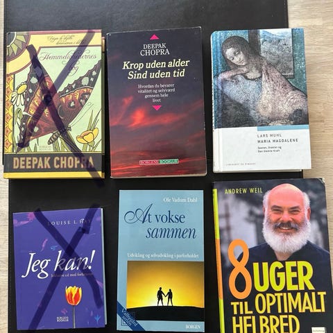 1) Deepak Chopra – "Hemmelighedernes bog". Dansk udgave. Indbundet bog. Chopra gennemgår en række spirituelle og filosofiske temaer med fokus på indre liv, bevidsthed og selvforståelse. Kr. 35,-