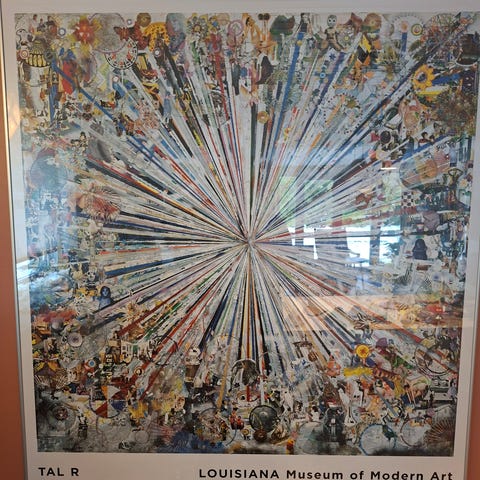 Louisiana-plakat med værket, Adieu Interessant (silver), (2005-2008) af den danske kunstner, Tal R (f. 1967). Tal R viser her sin optagethed af collagens lag på lag med en eksplosion af farver og udklip - et værk, han arbejdede på gennem flere år.