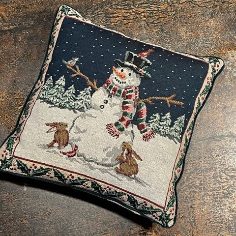 Pyntepude med vævet vintermotiv forestillende dyr i sneklædt landskab med kirke og træer. Puden har mønster på forsiden og ensfarvet bagside med lynlås i kanten. Velegnet som dekorativ pude i stue, soveværelse eller som sæsonpræget jule- og vinterpynt i hjemmet.