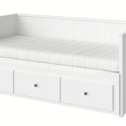 IKEA hemnes udtræksseng i hvid med panelgavle og integrerede skuffer under liggefladen.