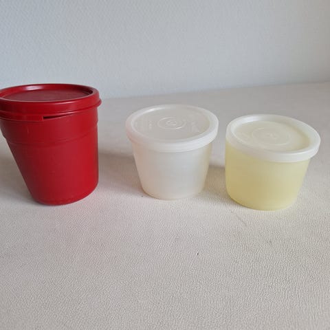 2 vintage Tupperware høje og smalle opbevaringsbøtter (moduletter) med røde låg - måler i højden 28,8 cm - bredde 9 cm og dybde 18 cm.