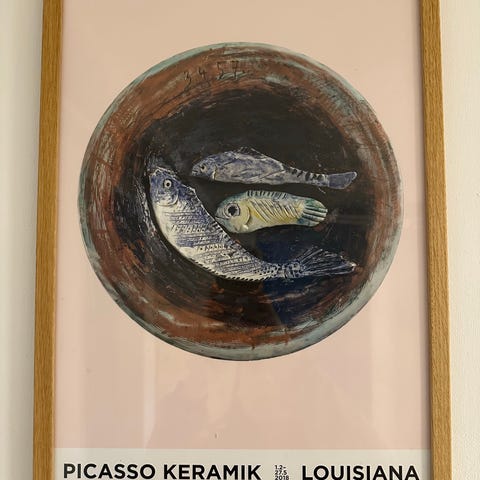 Louisiana Picasso plakat med motiv af keramik-hoved i sort, brun og hvid på lys baggrund. Plakaten er indrammet i en enkel, sort ramme. Egnet til ophæng i stue, kontor eller andre opholdsrum.
