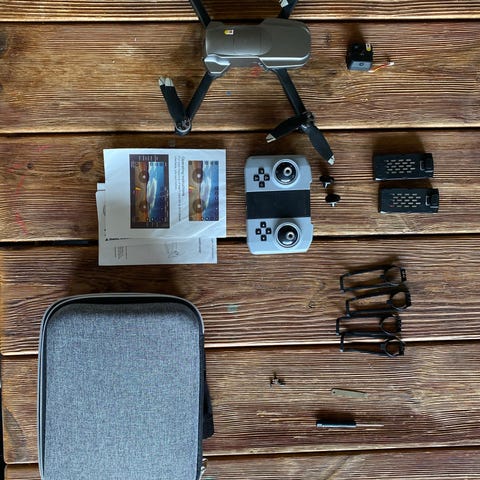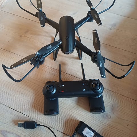 Der medfølger udstyr som fjernbetjening, batteri og USB-opladerkabel. Velegnet til fritidsaktiviteter eller mere seriøs flyvning.