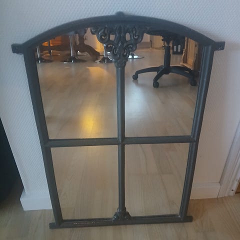 Spejl med blomsterdekoration på glasset. Rektangulær form, egnet til ophæng på væg i entré, soveværelse eller andre rum, hvor der ønskes et spejl med enkel, dekorativ detalje.
