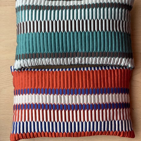 Fin (pynte)pude med kraftigt mønster-vævet stof. Og velour på bagsiden.