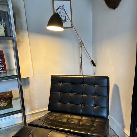 En ikonisk gulvlampe med klassisk britisk design, produceret af det danske firma GUBI. Kendetegnet ved sin minimalistiske og funktionelle stil.