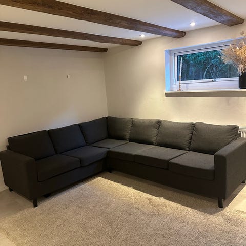 Vi sælger vores grå hjørnesofa fra myhome. 6-7 personer kan sidde på den. Meget behagelig. Sølv ben. Er blevet vedligeholdt med sofarens. Den trænger til omgang igen. Den måler 300 cm på den længste led og 264 cm på den korte