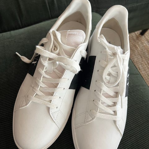 Armani Exchange sneakers i størrelse 43. Modellen er i hvid med blå detaljer ved hælen og logo på hæl og pløs. Klassisk snørelukning og flad gummisål med mønster under bunden. Velegnet som hverdagssko eller fritidssko. Stor størrelse.