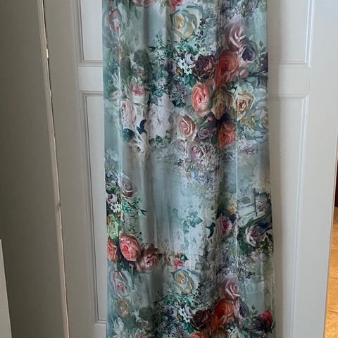 Karmamia festkjole i grøn satin i one size. Kjolen er lang med lige pasform og bindebånd ved halsen. Materialet er glansfuld terylane med mønstret overflade. Velegnet som fest- eller cocktailkjole til forårets konfirmationer eller bryllup. Modellen er Simone kjole gold jacquard