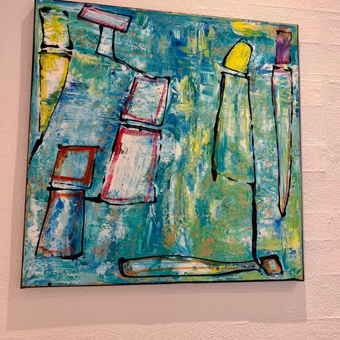 Abstrakt maleri med motiv i stærke og kontrastfyldte farver, herunder blå, gul, grøn, orange, pink og hvid. Maleriet har et ekspressivt, moderne udtryk med lag af farver og grafiske streger. Velegnet som vægdekoration i stue, kontor eller andre opholdsrum, hvor man ønsker et farverigt og kunstnerisk udtryk.