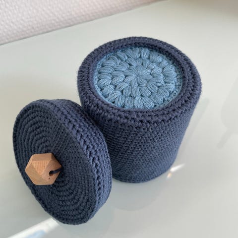 Sættet er hæklet / strikket i helt specielt, changerende bomuldsgarn i turkis og lilla farver.
