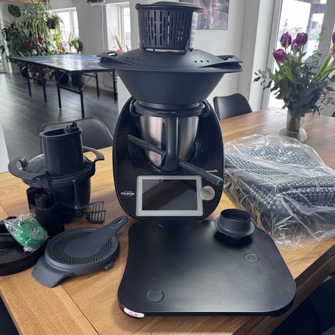 Thermomix TM6 i fint stand med diverse tilbehør som blandt andet varoma, kogeindsats, knivdække og børste. Tilbehøret som er vist på billederne er inkluderet.