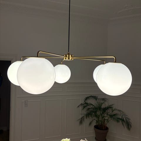 Kuplen kan monteres på enhver E27 fatning, men her kommer den som en pendel, med en 3 meter lang stofbetrukket ledning og sort loftbaldakin.
