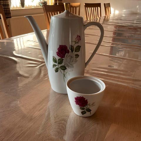 Sødt sæt bestående af kaffekande med låg, flødekande, sukkerskål med låg og lille ovalt fad med blomster i afdæmpede farver.